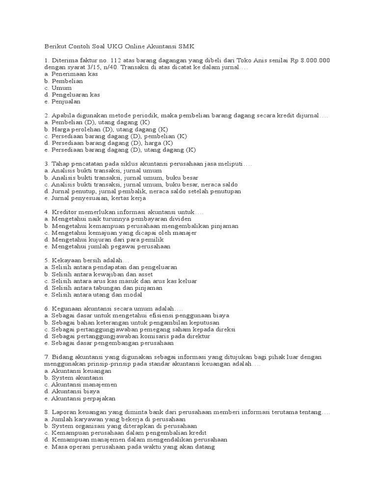 132 komentar untuk 35 contoh soal pilihan ganda Dasar dasar akuntansi jawabanya jurusan akuntansi Unknown 20 Agu 2018 230300 soal sangat membantu untuk berlatih dalam olimpiade akuntansi. Contoh file soal uts lengkap kelas 1 6 sd mi semua mata pelajaran 2016 2017 berikut ini adalah kumpulan dari berbagi sumber tentang contoh soal matematika kelas xii smk akuntansi yang bisa gunakan untuk bank soal download sd dan diunduh secara gratis dengan menekan tombol download biru dibawah ini. Kumpulan Bank Soal UKK Teori Akuntansi SMK Tamtama 1Sidareja by Aris Budianto 1 Page REKAP SOAL UN SMK AKUNTANSI 20082009 20092010 1.