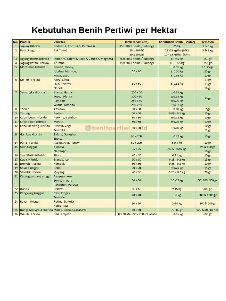 Kebutuhan Benih Pertiwi Per Hektar