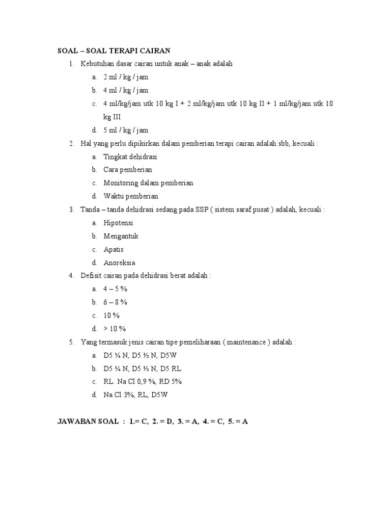 Contoh soal kebutuhan cairan. Contoh soal balance cairan. 1 Seorang pasien dengan berat 65 kg datang ke klinik dan membutuhkan 2400 ml cairan RL. Cara Menghitung Derajat Luka Bakar Pada Anak.