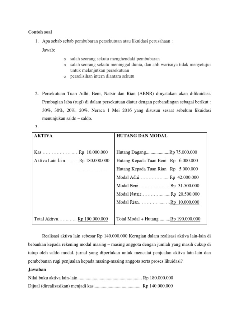 Contoh soal likuidasi. Akuntansi semester v kelas b fakultas ekonomi universitas katolik widya mandira kupang 2016 kata pengantar puji dan syukur penulis panjatkan kehadirat tuhan yang maha esa karena atas berkat dan karunia nya penulis dapat. Berikut ini adalah download silabus dan rpp kurikulum 2013 sd mismp mtssma smk ma semester 1 lengkap yang merupakan kumpulan file dari berbagi sumber 2017 tentang contoh soal akuntansi pembubaran persekutuan dan likuidasi. Apabila pada tahap pertama baru sebagian aktiva dapat.