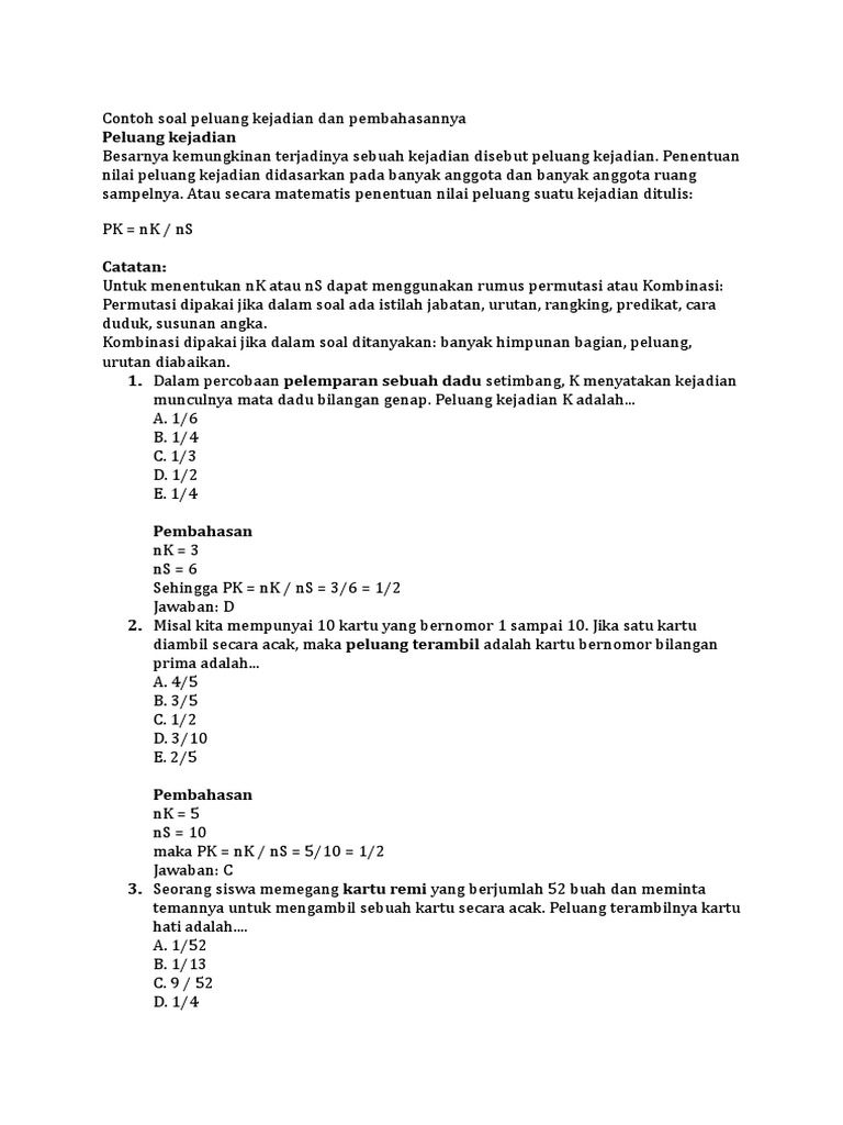 Rumus Peluang Kejadian Pre Man Kalem. Konsep ini telah dirumuskan dengan lebih ketat dalam matematika dan kemudian digunakan secara lebih luas dalam tidak hanya dalam matematika atau statistika tetapi juga keuangan sains dan filsafat. Titik sampel dan ruang sampel Dalam soal matematika Ujian Nasional seringkali kita menjumpai tipe soal yang sebenarnya mudah tapi cukup rumit kalua tidak mengerti asal mulanya dan cara mengerjakannya.