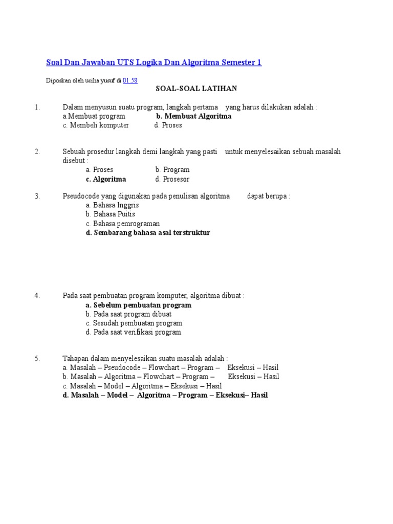 Soal Dan Jawaban UTS Logika Dan Algoritma Semester 1 Diposkan oleh uciha yusuf di 0158. Gambaran soal uas logika dan algoritma terbaru. Dalam menyusun suatu program langkah pertama yang harus dilakukan adalah.