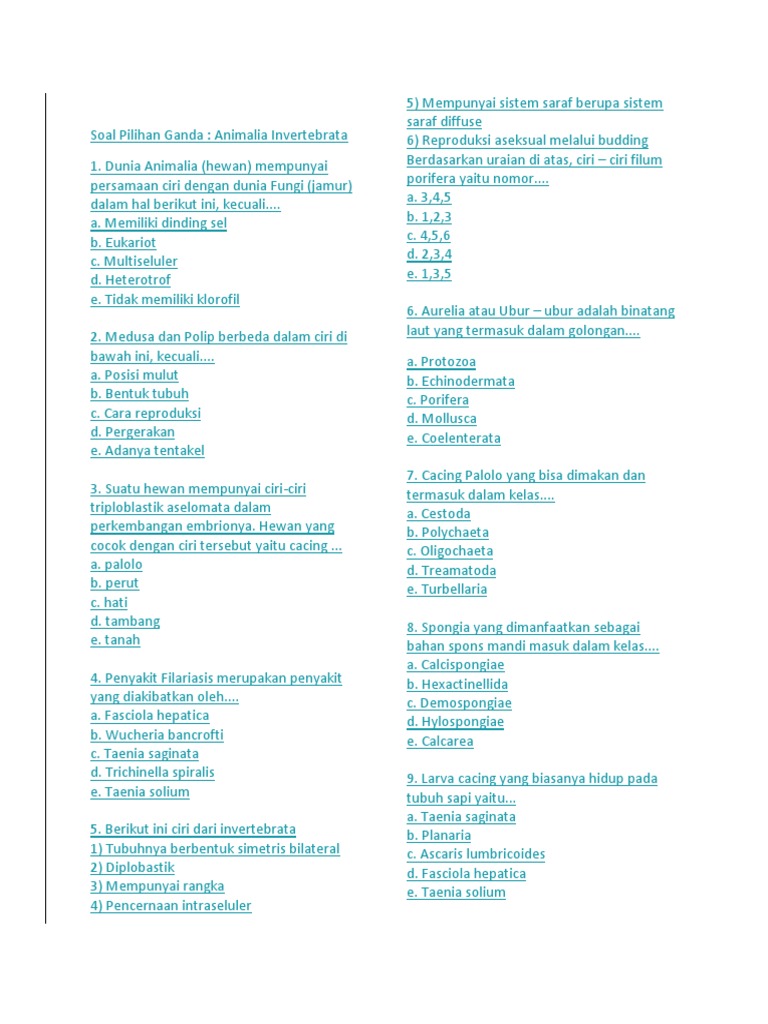 Pilihan ganda Pilihlah jawaban yang paling tepat. 75 Contoh Soal Hewan Invertebrata Pilihan Ganda Kunci Jawaban Oleh Anas Ilham Diposting pada April 7 2020 November 5 2020 Contoh Soal Hewan Invertebrata Pilihan Ganda beserta Pembahasan Hewan invertebrata merupakan hewan yang tidak memiliki tulang belakang dan perkembangannya organnya masih sangat sederhana. Itulah lima contoh soal materi Kingdom Animalia.