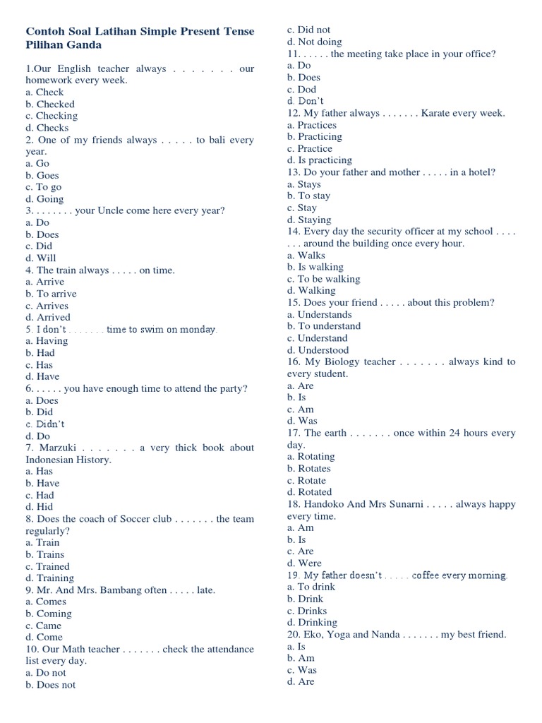 Soal pilihan ganda present continuous tense dapat digunakan sebagai alternatif untuk membantu siswa mengasah kemampuannya dalam menggunakan Tenses ini. Kumpulan Soal Present Tense Pilihan Ganda Present tense merupakan bentuk tenses dalam bahasa inggris yang digunakan untuk menjelaskan suatu kejadian atau peristiwa yang sering terjadi atau yang saat ini terjadi. B 10 c 11 d 12 b 13 a 14 c 15 b 16 b 17 a 18 a 19 c 20 c.